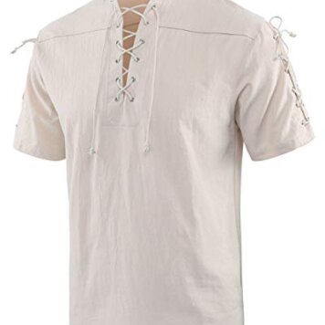 Men’s Medieval Renaissance Viking Pirate Costume Long Sleeve Linen Shirt V Neck Lace Up Stand Collar Retro T-Shirt