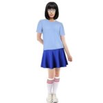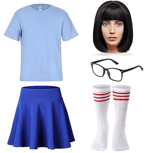 Halloween Costume Set: the package contains 1 piece of short black bob wig with hair net, 1 pair of black eyeglasses, 1 piece of light blue shirt, 1 piece of blue mini skater skirt and 1 pair of white tube socks with red stripes, complete in set to meet your dressing up needs for Halloween parties, cosplay events and more