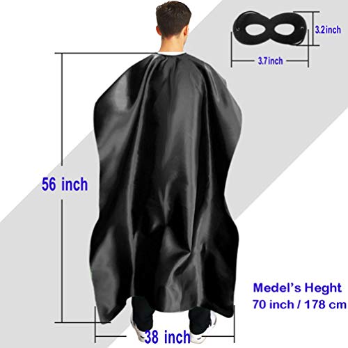 Size:Length 57 x Width 38 inch for capes. Our superhero capes and masks for adult bulk pack, are designed in perfect size after plenty of test; We have round neck hole, which fits better than simply sewed straight fabric with elastic. You can tie a bow with the cord to fit the neck. The masks ensure a snug with elastic but not too tight fit.