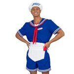 Available in sizes X-small through plus: deluxe costume includes 1 blue top and shorts set; 1 white apron; 1 “Steve” name tag; 1 “Ahoy” sailor’s hat; 1 ice cream scoop holder
