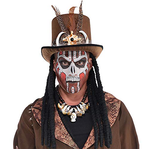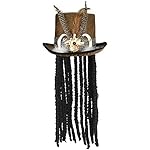 This costume accessory features brown velour top hat has attached faux dreadlocks, feathers, claws, and a metallic snakeskin hat band