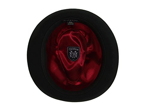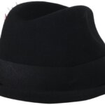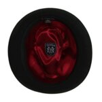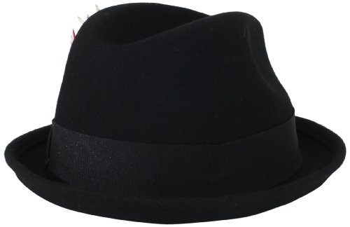Short-brim fedora in wool felt featuring grosgrain band with bow, metal logo plaque, and bright feather