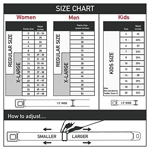 Our Seatbelt belts are 1.5 inch wide and are infinitely adjustable for pant sizes 24 to 38.