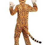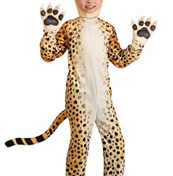 COSTUME INCLUDES: This cute cheetah costume for kids includes a cheetah print jumpsuit with a stuffed cheetah tail and attached paw gloves. A cheetah hood headpiece features a plush cat face and it also includes furry paw shoe covers that slip over the feet.
