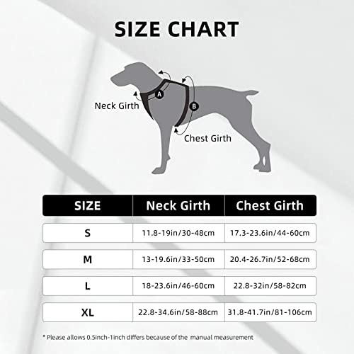 Size Guide: please measure your dog’s neck girth and chest girth in order to ensure you order the correct size. Size S: Neck 11.8-19in, Chest 17.3-23.6in. M: Neck 13-19.6in, Chest 20.4-26.7in, L: Neck 18-23.6in, Chest 22.8-32in, XL: Neck 22.8-34.6in, Chest 31.8-41.7in