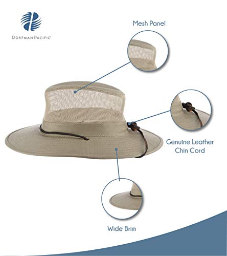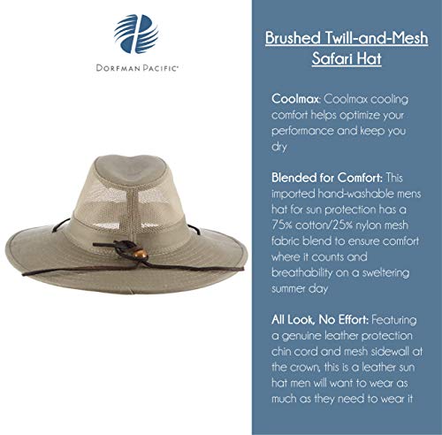 Dorfman Pacific Men’s Brushed Twill-and-Mesh Safari Hat with Genuine Leather Trim