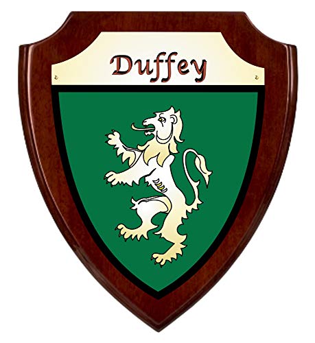 Duffey Irish Coat of Arms Shield Plaque – Rosewood Piano FinishThis piece of your family’??s Irish history is true to how it may have been originally used, painted in bright colors across a protective shield, turning a simple protective weapon into a symbol of honor, and as a way to recognize the fallen.Your authentic Irish family coat of arms is permanently imprinted in full color on a brass toned shield, which is then affixed with three brass screws to a handsome 8″ x 10″ Rosewood Piano Finish plaque. It will arrive ready to mount on any wall and to silently pay homage to the history of your Irish family. Choose from over 1000 available family coat of arms.Rosewood Piano FinishImprinted 4-color on a brass shield plateShield plate fastened with three brass screws8″wide x 10″highBackside – felt backingReady to hangChoose from over 1000 Irish crests
