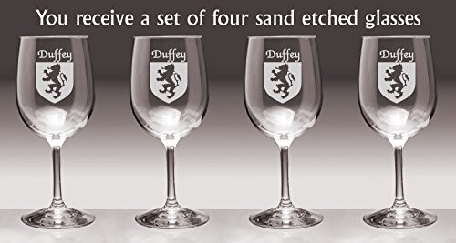 Duffey Irish Coat of Arms Wine GlassesWhat occasion couldn’t be made more special with a toast? And how special would it be to toast with wine glasses etched with your authentic Irish name and coat of arms?  For your most special occasions, or everyday weekday dinners, choose this durable, well-balanced and elegant wine glass, suitable for white or red. Each Irish coat of arms wine glass is permanently and professionaly sand-etched with your surname and family crest. 13 oz. Choose from over 1000 available coat of arms.Washing Instructions:Dishwasher and microwave safe. Authentic Irish Family Coat of Arms Over 25 years of Heraldry Research Set of 4 Irish Coat of Arms Wine Glasses (Sand Etched) High quality sand etching Each glass holds 13 ounces of your favorite Wine+Product height: 7-1/2″Maximum diameter: 3-3/8″Top diameter: 2-7/8″Bottom diameter: 3-1/4″