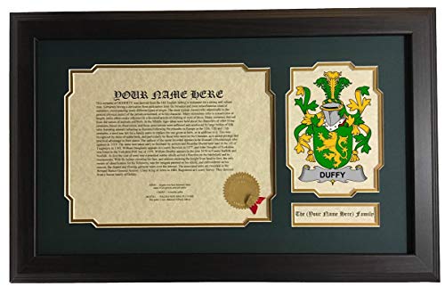 The Coat of Arms and Last Name History print includes the ancient origin of the name, recorded spelling variations, family motto (If available), and a high-quality, full-color rendition of the earliest coat of arms associated with the surname. Laser printed on parchment cardstock, matted in a dark-green matting with gold trim, and framed in a 1 inch thick dark wood frame measuring 14 x 22 inches total.