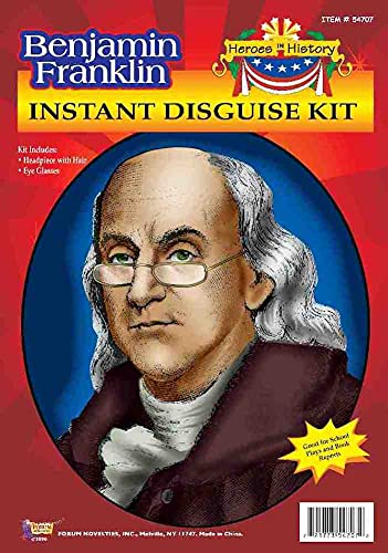 IMPORTANT DETAILS: Benjamin Franklin kit includes glasses and a long gray wig attached to bald cap. Ideal for patriotic plays or parades.