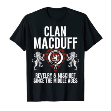 MacDuff Clan Coat Of Arms On a MacDuff Scottish Tartan Background, with text that says: Revelry and Mischief Since The Middle Ages. This Celtic design is perfect for any member of the MacDuff family to wear their Clans Crest Badge proudly