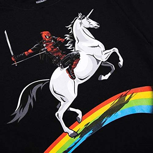 Features a full color graphic of Deadpool riding a unicorn on a rainbow