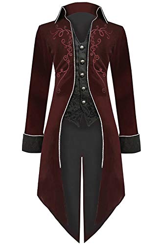 ★Halloween Costumes for Men: Unique renaissance vintage long tailcoat for mens/males/teens/adults, stand lapel collar, single breasted, full lining, button up, folded cuff, long sleeve, unique and exquisite embroidery on front and back, frock tail, slim fit. Dressup as beast/pirate/vampire/circus ringmaster/ringmaster/captain/king/with it.