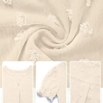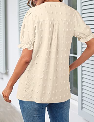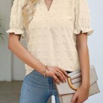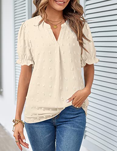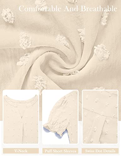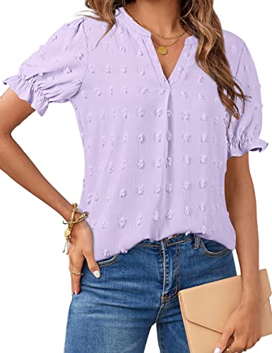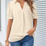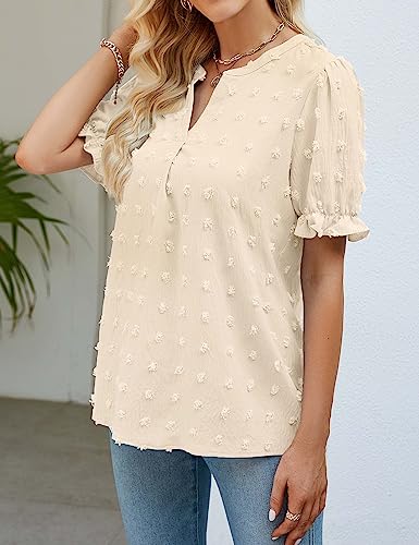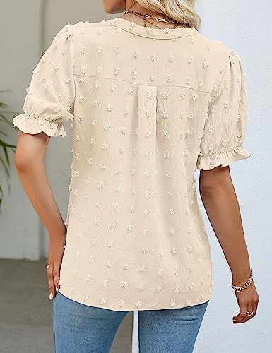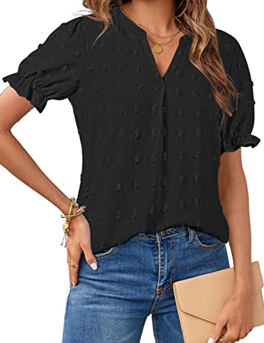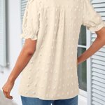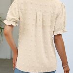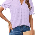 Features: V-neck, puff short sleeves, solid color, swiss dot details add more sweetness, and the tunic length makes it easier to tuck the hem into the pants, creating a fashionable and elegant appearance, womens tops dressy casual.