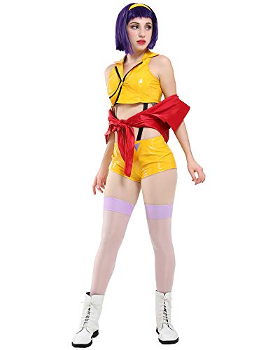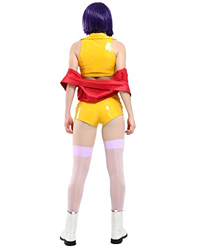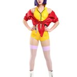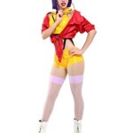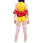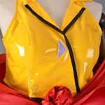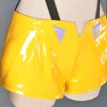 Bright yellow vest and pants are made of pu leather with some stretch.