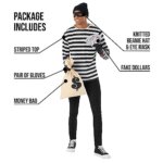 Get The Authentic Robber Look: Our product comes with black and white striped long shirt, premium striped beanie hat, black eye mask, black gloves. If that wasn’t enough we also include a money bag and a wad of dollar bills (not real sorry)