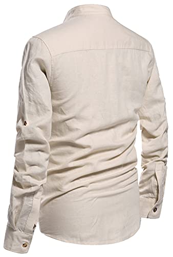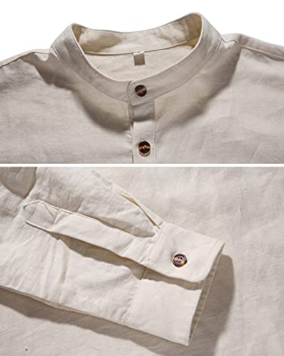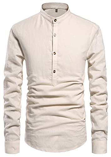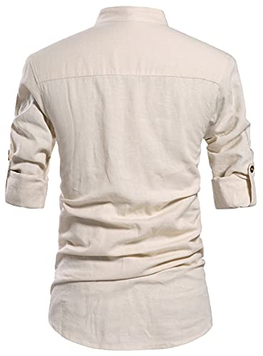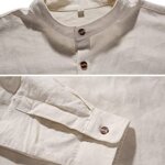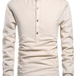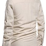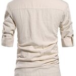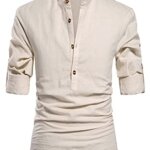 Casual henley shirts, Roll-up Sleeves, Long Sleeve linen shirts, Button Front, Stand collar, featured button detail.