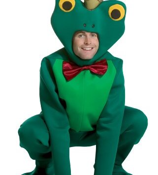 The Frog Prince costume includes green pants with matching shoe covers. Two-toned green top with attached red bow and frog princ