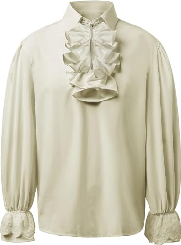 FEATURE: Mens goth dress shirt design in loose fit,Ruffle front,retro style,cosplay costume shits, beautiful lace embroidered flared cuffs with elastic band in wrist,long sleeve,turn down collar,solid color.