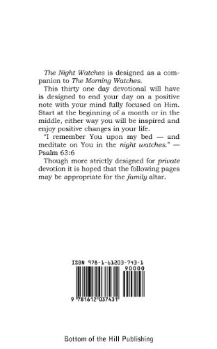 The Night Watches is designed as a companion to The Morning Watches. This thirty one day devotional will have is designed to end your day on a positive note with your mind fully focused on Him. Start at the beginning of a month or in the middle, either way you will be inspired and enjoy positive changes in your life. “I remember You upon my bed – and meditate on You in the night watches.” – Psalm 63:6 Though more strictly designed for private devotion it is hoped that the following pages may be appropriate for the family altar.