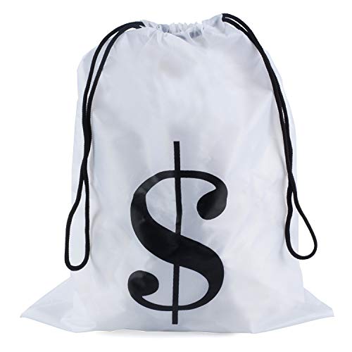 The black top hat inner diameter measures approximately 7.5 inches. The realistic white mustache measures 5 inches long and has a sticky back. The bow tie measures 19 inches long and has an adjustable clip. The white draw string money bag measures 15″ long x 11″ wide.