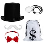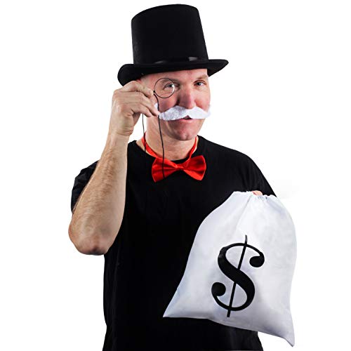 This 5 – piece set comes with a black felt top hat, a red bow tie with an adjustable clip, a white mustache, a monocle, and a white money bag with drawstrings.
