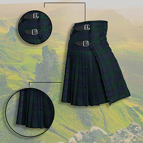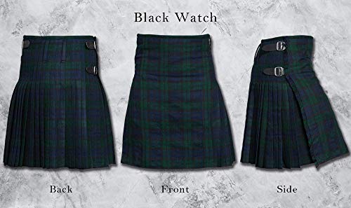 KILT FOR MEN : 8 yards Acrylic wool Tartan Kilt of 16 oz. with Cotton lining, deeply Pleated back – down from waist to hip and is flat across the front. Premium quality 3 leather straps allowing 2 inches of adjustment, with rust free chrome buckles for fastening.