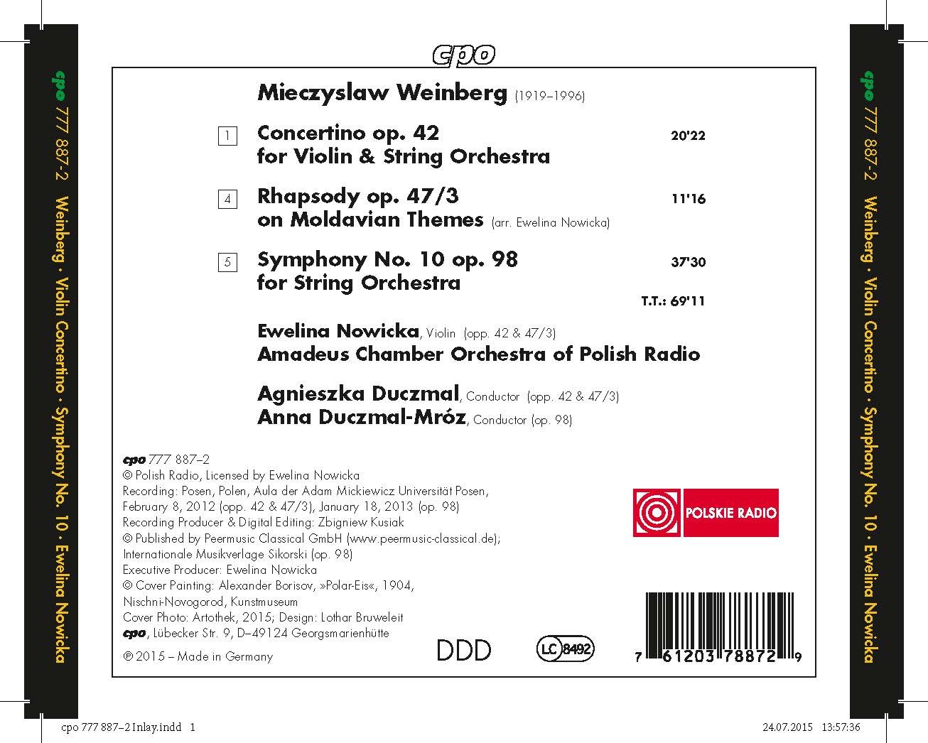 Gradually and fortunately the extensive and highly significant oeuvre of the Polish-Russian composer Mieczyslaw Weinberg has been discovered and recognized in the West a process documented, in part, through the efforts of the internationally highly regarded cpo recordings. The Symphony No. 10 is the most stylistically advanced and experimental composition among his purely instrumental works. Impressed by his compositions, violinist Evelina Novicka has recorded several premieres of his works, including the Concertino op. 42 and Rhapsody op. 47 heard on this most CD.