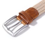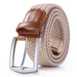 Alloy buckle. Belt material: 65% Polyester / 20% rubber elastic / 15% Cotton. 1.3inch wide .